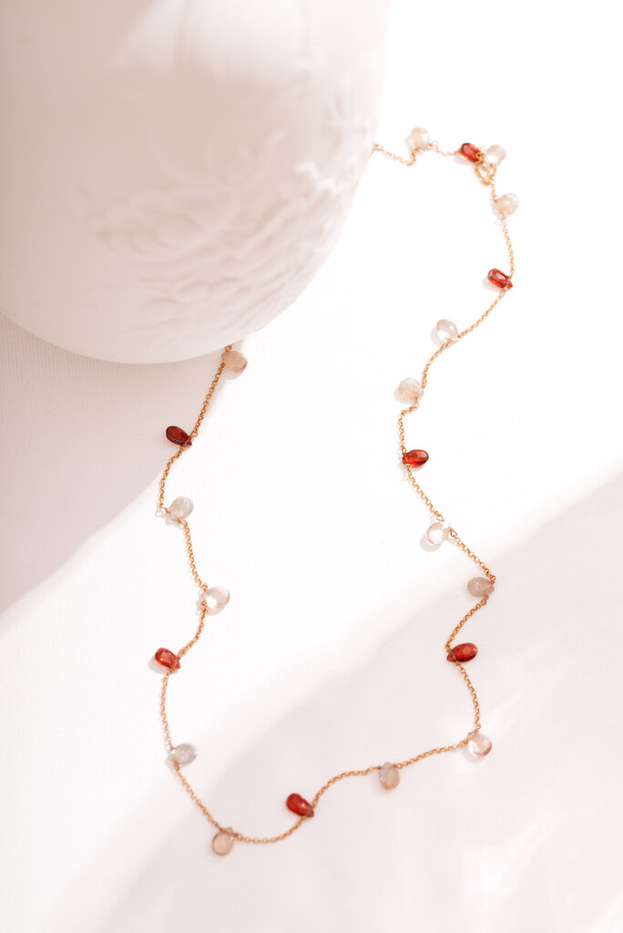 Ασημένιο επιχρυσωμένο κολίε με γρανάδες και καπνια στο σχήμα σταγόνας.