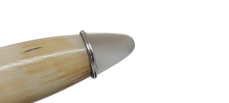 Μοναδική δημιουργία του εργαστηρίου μας τοποθετημένη σε κουτί plexi glass (μαύρη βάση – διάφανο καπάκι κουμπωτό). Και τα τρία αργυρά 925 στοιχεία που συνθέτουν την κατασκευή μας (βάση στήριξης με δαχτυλίδι εισδοχής, τάπωμα απόληξης ελεφαντόδοντου και τελείωμα άκρης) είναι εξ ολοκλήρου χειροποίητα και βασίζονται στα ειδικά χαρακτηριστικά του ελεφαντόδοντου.